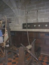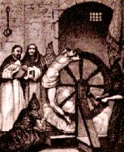 This device was similar to the rack, above, but the prisoner was tied to the circumference of a wheel. Various other tortures could be applied while the victim was immobilized, the most common of which was rotating him through a fire built below the wheel. Apparently this type of torture was used frequently by religious persecutors in the Middle Ages.