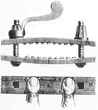 This nasty little device was small and portable, and did not cause death; its sole purpose was to apply pain. The prisoner's thumbs were imapaled on a small spiked board, and then covered with a top plate, also containing small spikes, that could be tightened with screws.