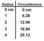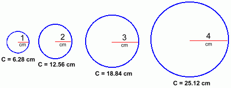 Here are four circles, with radii of 1 cm through 4 cm. The corresponding circumference of each circle has also been measured.