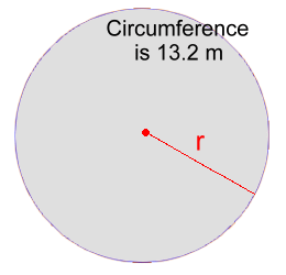 Example 4:The circumference is 13.2 m. Find the radius. C = 2·π·r 13.2 = 2·π·r 13.2 ÷ 2 ÷ π = r 2.1 m ≈ r There are all sorts of problems you can solve using these formulas: Example 5: