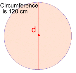 Example 3:The circumference is 120 cm. Find the diameter. C = π·d 120 = π·d 120 ÷ π = d 38.2 cm ≈ d