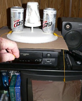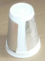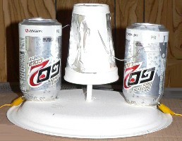 ![]() ![]() You'll need a paper plate, two pop cans, a styrofoam cup, two paperclips, some wire, a cheap ball point pen, aluminum foil, tape, and some glue. You'll also need some scissors, and some sort of pliers that can cut a pointed end on a paperclip We used wire test leads with alligator clips at the ends to make attachments more quickly, but if you don't have any of these, you can attach the wires with tape. Don't use contact cement; we discovered too late that it dissolves styrofoam, and had to start over! Instead we used a hot-glue gun and plain white glue. ![]() ![]() Cut them and attach them so that two half-inch gaps are left on opposite sides of the cup, as shown at the right. Smooth them out to flatten the wrinkles, and make sure the edges of the foil are glued down flat. You might also want to trim the uncovered styrofoam rim below the foil, to make the cup lighter; we didn't do that. ![]() ![]() Attach the flat side of the plug, using hot glue, to the exact centre of the inside bottom of the cup. Make sure it really is centred exactly, and sitting flat on the bottom. Place the metal end of the pen into this little plug, balancing the cup upside down on the pen, and spin it to make sure the plug is centred and that the cup spins easily. ![]() ![]() Glue the end of the pen to the centre of the back of the paper plate, using hot glue, as shown in the photo at the left. Place the cup upside down on the pen, making sure the tip fits into the plug. Then glue the two pop cans upside down onto either side of the cup, leaving half an inch or so of space between the cans and the cup, so the cup can spin without touching them. Now prepare the paperclips. Do the following to each paperclip: straighten two of the bends, leaving one bend at the end. Twist the paperclip into an 'S' shape. Now take one of the paper clips and tape the bent end onto the right can, as shown in the photo below left. Make sure the sharpened straight end is pointed directly at the foil on the cup, about a half inch away; the pointed end should be the closest part of the paperclip to the cup. Next, do the same thing to the other paperclip, on the left can. When you're done, the set-up should look like the photo at the right below. ![]() ![]() ![]() Place the apparatus near an older television, and spread the foil across the screen. Hold the left wire in your hand ... your body will be the ground. Give the cup a slight turn if necessary, so that the pointed ends of the wire are next to the foil rather than the gaps between. Now turn the TV on. The cup should begin to turn. As it slows down, turn the TV off. This will cause the cup to turn some more. Continue turning the TV on and off to make the cup motor keep turning. ![]() The right can and the paperclip attached to it get charged up with electrons from the TV screen. These excess electrons on the can and paperclip are under pressure to escape, and this pressure is highest at the very tip of the paperclip. The pressure of electrons is so high there that they can jump off into the nearby air! This causes the air near the tip of the paperclip to become negatively charged, and it is then repelled by the still negative paperclip. The negatively charged air moves away from the paperclip and towards the nearest piece of foil, which they jump on to. Now this foil is negatively charged, along with the right can, and they repel each other. The foil, being attached to the cup, can rotate away from the can, and it does. But there's more. The negatively charged foil repels the electrons in the left can, leaving behind a positive charge on the left can, which now can attract the foil. So this also helps to rotate the cup. After the cup has revolved half way, the excess electrons can escape in a similar fashion - through the air onto the left can, and out through the ground. This leaves the original piece of foil neutral and ready to begin the cycle over again. Meanwhile, the other piece of foil is going through the whole process too. |
