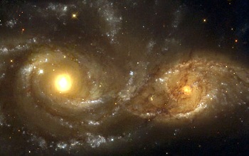 The spiral galaxies NGC 2207 and IC 2163 are gravitationally locked together, and will slowly pull each other apart over the next few billion years, creating huge sheets of dust and gas, bursts of star formation, and streams of cast-away stars. Their last close encounter was 40 million years ago. NGC 2207, the larger galaxy on the left, will eventually swallow the smaller one on the right.