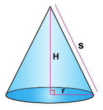 Characteristics of a ConeThe base is a circle, with radius r The height down the centre is the height H The length down the side is the slant height s Because of the right angle, you can find any missing one of these three measurements by using the Pythagorean Theorem. We will look at how to calculate the volume and surface area of a cone. We'll also look at problems where you know the answer and must find one of the cone's measurements by solving backwards. We'll also try some questions where a missing measurement must be determined first. Finally, we'll try some mixed problems. In all of our examples, we will assume that you are proficient at solving simple equations. |