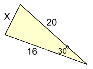 x2 = a2 + b2 - 2·a·b·cosθ x2 = 162 + 202 - 2·16·20·cos30 x2 = 101.74 x = 10.1 rounded to 1 d.p. The other sides can now be found using the sine law. Example 2: Find side X