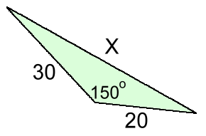 x2 = a2 + b2 - 2·a·b·cosθ x2 = 202 + 302 - 2·20·30·cos150 x2 = 1819.62 x = 42.7 rounded to 1 d.p. The other sides can now be found using the sine law. Let's use the second formula to find a missing angle >>> |