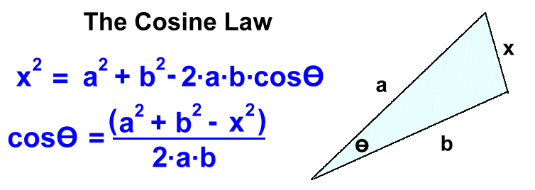 ![]() The cosine law is used in order to solve non-90° triangles where the sine law won't work. These are recognized by the missing side being across from the given angle, or when solving for the angle, all three sides are known.