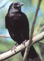 ![]() ![]() Crows are thought to be the most intelligent of all birds. A crow is a large black bird that lives everywhere the world except Antarctica, New Zealand, and South America. Crows belong to a family of birds which also includes jays, ravens and magpies ... the family Corvidae. The common crow (also called the American crow, Corvus brachyrhynchos) lives in open areas, farmland, the edges of woods, and parks throughout North America. Crows usually stay in the same region the year around ... only those living in the far north migrate south for the winter. ![]() The American crow is about 43 to 53 centimeters long. It has black shiny feathers and a strong, sharply pointed bill. Male and female American crows look alike, but the female is slightly smaller. The female lays four to six greenish-blue eggs with brown spots; these are incubated for about 18 days. Both the male and female care for the young, which are called simps; they leave the nest after about a month. Adult crows live for about 10-12 years. Owls and hawks are two of the main predators of crows. Crows in flocks will often attack an intruding hawk or owl in an attempt to drive it from their territory. Humans are also responsible for killing many crows. ![]() ![]() Crows are omnivorous (like humans) ... they eat just about anything. They will eat a farmer's crops, and are especially fond of corn. They also feed on many kinds of insects, spiders, small birds, eggs from other birds' nests, seeds, rodents, and the flesh of dead animals. They will also consume garbage. Often crows will hoard food, sometimes burying it. The crow is now understood to be a highly intelligent animal, capable of complex communication and problem-solving. Crows drop nuts on the street and wait for automobiles to crush them, then fly down to eat the pieces. They will use a short twig (that they have pruned and shaped in advance), held in their beak, to dig insects out of the bark of a tree. It was previously thought that only primates had this ability. There are many anecdotal records testifying to the intelligence of this bird: ![]() - Nature writer Candace Cavage describes a crow that moistened dry food provided by humans, by filling a small plastic cup with water and dumping it over the food! - There are documented cases of crows assisting wounded members of their flock by distracting predators. - British zoologists were amazed when they saw a captive crow called Betty making a hook out of wire to reach food. This was the first time any animal has been observed creating a new tool for a specific task. ![]() |