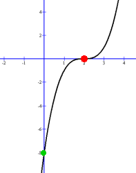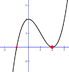 A cubic function must have three intercepts, but they don't have to be different. Here we'll look at an example with three Real intercepts where two are the same, and another with three identical Real intercepts. . (1) Two Identical Intercepts y = x3 - 3x2 + 4 The y intercept is (0, 4) To find the x intercepts, we need to find one zero first, and divide to find the others. The possible zeros are +/- factors of 4, which are +/- 1, 2, and 4 By substituting into x3 - 3x2 + 4, we eventually find that -1 makes it equal zero. So a zero of the polynomial is -1. Now we know one factor is (x + 1) Divide (x3 - 3x2 + 4) by (x + 1) to get (x2 - 4x + 4) (x2 - 4x + 4) factors into (x - 2)(x - 2) So x3 - 3x2 + 4 = (x + 1)(x - 2)(x - 2) = (x + 1)(x - 2)2 This makes the three zeros -1, 2 and 2, and the x intercepts (-1, 0), (2, 0) and (2, 0)