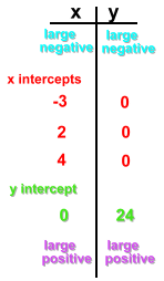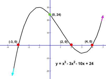 The characteristic shape of a cubic function graph is sort of a flipped 'S'. A key attribute is that the direction it curves will change at some point; here that happens at (0, 0). But the graph can also curve down and up again more dramatically, as we'll see in the first example below. Here's an example of a more general cubic function. We'll describe and find its attributes. y = x3 - 3x2 - 10x + 24 In this form, the function tells us only that the y intercept (when x is 0) will be +24. (You did this with linear functions in grade 10 math). In order to find the x intercepts, we will have to factor the polynomial equation, just as you did for quadratic functions in grade 11 math. However, you have never learned how to factor a general cubic function until now. We'll show you that too. The end result will look like this: y = x3 - 3x2 - 10x + 24 y = (x - 2)(x + 3)(x - 4) after factoring so that the x intercepts when y = 0: 0 = (x - 2)(x + 3)(x - 4) are 2, -3, and 4 When you fill in a very large value of x into y = x3 - 3x2 - 10x + 24, the x3 term becomes very much larger than the rest of the expression, so the resulting y value will also be very large. Because x is cubed, the large value will share the sign of the large x. Saying this mathematically: As x approaches +∞, y also approaches +∞ Alternatively, as x approaches -∞, y also approaches -∞ So the graph goes up to the right, and down to the left. Here are the table and graph that summarize all the information we have. It's generaly not necessary to find any more points than these. ![]() ![]() In Math 30 you aren't required to identify the local maximum and minimum values where the graph loops, although you can easily find them on a graphing calculator. This means your graph won't be very accurate where you sketch in the loops. You can use a graphing calculator to help if you want, but that isn't really necessary. In Math 31 (calculus) you will discover that you can use the first derivative of the function to find the two places where the slope is zero. Now let's look at examples that illustrate all the things that can happen with cubic functions. We'll dispense with the colour coding and some of the explanations, but will include a review of the algebra needed to find the x intercepts. This will by no means be a complete explanation of all possible cubic functions; we're just going to examine some of the basic ones you're most likely to see in Math 30. |