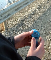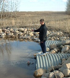 ![]() ![]() We are able to make some simple measurements at the culvert: - distance to the surface of water, from the top of culvert - radius of the culvert - length of the culvert - width of the water surface in the culvert In addition, we can fairly easily work out the rate of flow, in metres per second. With all of this data, we'll show you how to make an estimate of the volume of water flowing through the culvert in cubic metres per second. ![]() There is a standard formula for calculating the rate of quantity flow for a stream, pipe, or culvert: Quantity (m3/s) = water velocity (m/s) x cross-sectional area of water (m2) We'll need to know how fast the water is moving, and the cross-sectional area of water in the culvert. (For simplicity, it will be assumed a perfect cylinder) Velocity of the Water: We don't have a device for measuring this, but it is fairly easy to calculate. We'll drop something in the water at one end of the culvert, and time how long it takes to reach the other end. Kenneth is going to help us with these measurements. ![]() ![]() ![]() The length of the culvert is 20 metres. The object dropped into the water took about 100 seconds to travel this distance. This makes the velocity of the water approximately 20 m in 100s, or 0.2 m/s Area of the Water in the Culvert ![]() So instead we'll make an approximation of this area, the area shown in the diagram in blue, at the right, which represents the area of the water in the pipe for a culvert more than half full. This calculation is shown below. ![]() ![]() The difficulty lies in calculating the area of the light blue segment, which has curved ends. The formula for this area is too complicated to make use of here. Instead, we'll find the area of the outer and inner rectangles surrounding this segment, and average the two. The answer will be quite close to the actual area of the segment. Let's do the calculations with variables first, to obtain a formula. Then we'll use the actual measurements from the water in the culvert to calculate its area. ![]() ![]() x is the distance from the top of the culvert, down to the surface of the water. r-x is the difference between the radius and the number above (or the water's height above the cylinder's centre) z is the width of the surface of the water in the culvert. The dimensions of both the outer and inner rectangles are shown at the right. We want to average them. ![]() At the right is the calculation showing the total cross-sectional area of the water in the culvert, including both the half-circle below, and the approximation for the area above centre. The half-circle below centre has the area formula A = (pi · r2)/2 Both the outer and inner rectangles have the area formula A = L x W We are adding these two areas, and dividing by two to average them. In the last step, we factored out the (r-x) to make the final formula a little simpler to work with. Now let's use it with the actual culvert measurements ... ![]() ![]() At the right is the formula with the actual values filled in; this gives us the total cross-sectional area of the water in the culvert. Although this value is an approximation, it is certainly close enough for our purposes. Area of water in pipe = 2.34 m2 ![]() Now let's go back to the formula for calculating the rate of quantity flow for a pipe: Quantity (m3/s) = water velocity (m/s) x cross-sectional water area (m2) Q = V · A = 0.2 m/s x 2.34 m2 = 0.47 m3/s or about half a cubic metre, per second. 0.5 m3 per second corresponds to 30 m3 per minute, or 1800 m3 per hour. This is equivalent to about 63,500 cubic feet per hour, or about 1,060 cubic feet per minute, or approximately 6600 gallons per minute. Here are some conversion factors you might find useful: