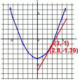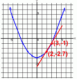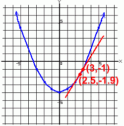 Using the point (2, -2.7) and the point (3, -1), the secant this time is steeper still; in fact, its slope turns out to be 1.7