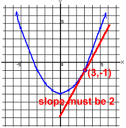 We could be sure of this by doing the same exercise all over again, from the other side of (3, -1). If we did, we'd find that the slopes got smaller and smaller as our secant lines got closer and closer to the tangent; the slopes would again seem to approach the value 2