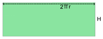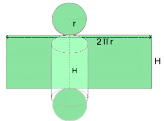 The surface area formula has three parts:TOP: circle area π·r2 BOTTOM: circle area π·r2 CENTRE WRAP-AROUND SECTION: This is a rectangle: - Its length is the distance around, which is the circumference of a circle: 2·π·r - Its width is H So its area is 2·π·r·H Surface Area = 2·πr2 + 2·π·r·H Example 4: Find the surface area
