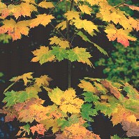 Evergreen trees like pines, spruce, and fir, keep their green needles all year long. But when the cold winds come in late fall, something wonderful happens to the leaves of other trees. On deciduous trees everywhere, the leaves turn amazing shades of yellow, orange, red, and brown, and then they fall to the ground, leaving the branches bare. How does this happen, and why? Let's find out. Wherever there are deciduous trees, like poplar, maple, oak, birch, and elm, all of the leaves will lose their green colour, changing to every possible shade of yellow, orange, brown, and red. Unfortunately, there are very few of these trees in northern Alberta; our range of colours is limited to the yellow hues of the poplar tree, and a small bit of red on the occasional willow. But the change is still spectacular. Almost overnight, trees turn from green to a blaze of yellow. Let's look at how the trees accomplish this amazing transformation, and why. Green plants make their own food. Deciduous trees do this in their leaves, which contain a chemical called chlorophyll. This chemical helps the leaf turn sunlight into food, using a a process called photosynthesis, and it mixes the food with liquids brought up from the soil, and sends it to all the cells in its body. Chlorophyll is a green chemical, which is why leaves look green. In the winter, there isn't much sunlight to make food. But more importantly, any liquid travelling through the thin stems to the leaves, and any liquid in the leaves themselves, would freeze solid in the cold weather. So the leaves aren't needed during the winter months. As it starts to get cold, the tree prepares to get rid of its leaves. Now that the green chlorophyll is gone, you can see the true colours of the leaves, which are actually yellow, gold, and brown. New chemicals also form in some leaves as they die, adding a red, orange or sometimes purple tint. At this point, the leaves are ready to fall. The stem cells between the two layers of sealing cells are dying too, and aren't as strong as they once were ... they can no longer support the weight of the leaf. For a while, the only things still holding the leaf to the tree are the tiny veins through which the liquid used to travel. But these thin strands soon break in the breeze, and the stem snaps off at the spot just between the two layers of sealing cells. The colourful leaves fall to the ground. But soon, most of the chemicals in the leaves that made the colours also begin to disintegrate. The colours fade. Eventually all the leaves are a dull brown, the colour of tannin, which is the only chemical left in the leaves. |