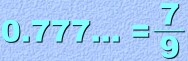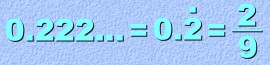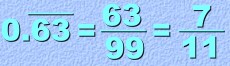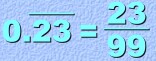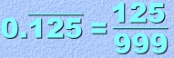 If more than one digit repeats, then the fraction will be over more than one '9'. For example: ![]() In this case, the digits '17' repeat over and over. So the fraction is '17' over two nines. Here are two more like that. Notice again that these are over two nines because two digits repeat: ![]() ![]() And once again, if the fraction you get can be reduced, you must reduce it. Here's a final example with three repeating digits. So of course the fraction will be over three nines: ![]() Here is the rule, summarized one more time: is that number over the same number of nines.' |