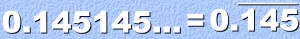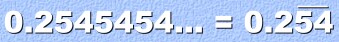 Repeating decimals are not terminating. A repeating decimal continues on forever. One or more of its digits repeats continuously, and the decimal is infinite in length. Here are some examples: ![]() Notice that even though the two's go on forever, you don't have to write all of them. (You couldn't!) There are several simple ways you can write an infinitely long decimal... You can either: - include three of the repeating digits, and then use three dots to show that it goes on forever - include just one repeating digit, and put a dot over that digit We'll be using both methods, so you'll become familiar with them. What happens if more than one digit repeats? Here's an example: ![]() We wrote three repetitions of the '27' before using the three dots. Then, instead of a dot over the repeating digits, we used a bar over the repeating part. Of course, the repeating part can be any length at all. Here's an example with three repeating digits: ![]() To be perfectly correct, we should have included three repetitions of the '145' before using the three dots. But this can get a little tedious if the repeating part is long, so sometimes you just repeat it twice. You must repeat it at least twice, so it is perfectly clear what is repeating. The bar method is a lot less work! It's also possible to have a decimal where part does not repeat, and part does. For example: ![]() Look at this decimal very carefully. Notice that the '2' does not repeat. The '54' does ... and it's the part with the bar over it. Watch out for repeating decimals that are written incorrectly. For example, what decimal is this? 0.135... Does the entire '135' repeat? Or just the '5'? Nobody knows! That decimal was written incorrectly, and is a mistake. It should have been written as: 0.135135..., or perhaps 0.13555..., depending on what the person meant who wrote it. Better yet, write it with a dot over the repaeting digit(s). |