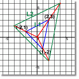 Here is the image, shown in green. It seems to have the same shape and orientation as the original figure. We can check that it really has been enlarged by a factor of 2 by measuring the corresponding sides, which should now be twice as long. Shown here as an example, side L2 is twice as long as side L1.