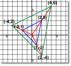 This worked exactly the same as the one we did on page 1. But there's a difference. When you are doing a dilatation on a set of x-y axes with the point (0,0) as the centre of dilatation, there is a great shortcut you can use. It will be obvious when we identify the image points below.