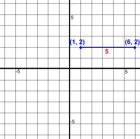 Here are two points (1, 2) and (6, 2)They are aligned horizontally. It's easy to find the distance between them, or the length of the line joining them, shown in blue. Just count squares. The distance is 5 units. We could also use a simple formula: Δx is the difference between the x coordinates of the points. Δx = 6 - 1 = 5 Let's try another one.