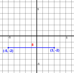 Here are two points (-5, -2) and (3, -2)They are aligned horizontally. It's easy to find the distance between them, or the length of the line joining them, shown in blue. Just count squares. The distance is 8 units. Using the formula: Δx is the difference between the x coordinates of the points. Δx = 3 - -5 = 8 The formula may seem unimportant, but we'll need it later. Vertically Aligned Points