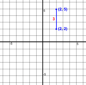 Here are two points (2, 2) and (2, 5)They are aligned vertically. It's easy to find the distance between them, or the length of the line joining them, shown in blue. Just count squares. The distance is 3 units. We could also use a simple formula: Δy is the difference between the y coordinates of the points. Δy = 5 - 2 = 3 Let's try another one.