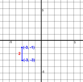 Here are two points (-3, -3) and (-3, -1)They are aligned vertically. It's easy to find the distance between them, or the length of the line joining them, shown in blue. Just count squares. The distance is 2 units. Using the formula: Δy is the difference between the y coordinates of the points. Δy = -3 - -1 = -2 Distances are always positive, so the answer is really 2 Let's use the above example to point out two things: