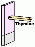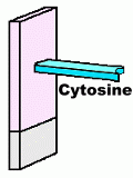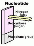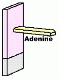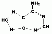 ![]() A nucleotide is a molecule containing three parts: a simple sugar called deoxyribose, a phosphate, and a special molecule called a nitrogen base. A DNA nucleotide can contain any one of four different nitrogen bases. These are adenine, thymine, guanine and cytosine. Nucleotides join together when the phosphate portion on one bonds with the sugar portion on another. ![]() Shown at the left is a very simple nucleic acid with just two nucleotides joined together ... one containing adenine and one containing guanine. Actual nucleic acids contain millions of these nucleotides attached to one another. There are just four possible nitrogen bases that can 'stick out' from a nucleotide. Here are all four of them: ![]() ![]() ![]() ![]() ![]() At the left is a longer nucleic acid shown in simpler form, with the four possible nitrogen bases indicated by letters: A for adenine T for thymine G for guanine C for cytosine Nucleotides can join together in any order, so the sequence of nucleotides can be any pattern like this: C - G - A - C - G - C - C - C - T - A - A - T - C and the pattern can continue for millions of molecules. The origins of the names: - Adenine is from the Greek word for gland, because it was first discovered in the pancreas. - Thymine was first found in the thymus gland. - Cytosine was isolated from cells ('cyto' means cell). - Guanine was originally located in bird guano (poop). ![]() Before we continue, let's look at a single nucleotide in a little more detail. First, at the right is the molecule adenine, one of the four nitrogen bases in a DNA molecule: Adenine isn't a very big molecule, and the other three nitrogen bases are similar in size, differing only in the way the atoms are joined together. When adenine is attached to the simple sugar deoxyribose, which is joined to a phosphate, you get a complete nucleotide, in this case the one containing adenine. It's called adenosine, and there's a diagram of it below, left.