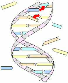 As the two strands of DNA ladder come apart, each contains the complete original pattern (although one is a 'mirror image' of the other). Each newly exposed nucleotide 'rung' now attracts and bonds to a corresponding new nucleotide from the cell fluid.