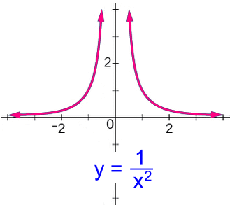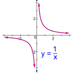 Here's another discontinuous function. You can't fill x into the equation because it would mean dividing by zero, so there is no value there. Also, there is no value you can fill in for x that would result in y being zero. It has two asymptotes, one the vertical line x = 0 and the other the horizontal line y = 0. Domain: x ε R, x ≠ 0 Range: y ε R, y ≠ 0