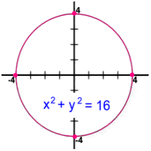 This circle graph has the equation x2 + y2 = 16. It has radius 4. The graph extends to 4 in all directions. This means that there are no points on this graph with x values bigger in size than 4, or y values bigger in size than 4. Saying this differently, the values for x and y are always less than or equal to 4. This is not a function, but we can still find domain & range. Domain: x ε R, -4 ≤ x ≤ 4 Range: y ε R, -4 ≤ y ≤ 4 (Notice the use of the 'between' notation from Math 9)