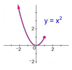Here's a simple parabola again, but there's part of it missing. The dot is solid, which means that point is on the graph. All of the x values are less than that point at x = 1. As with a full parabola with vertex (0, 0), the y values are all equal to or greater than zero. Domain: x ε R, x ≤ 1 Range: y ε R, y ≥ 0 |
