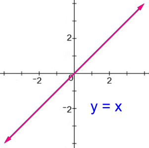 Our first example is a line. We chose the simplest oblique line, with equation y = x. When plotting the graph, we can choose any Real number for x. We say that the domain is any Real number. In symbols this is written: Domain: x ε R. This translates as 'x is an element of the set of Real numbers'. The function returns all the Real values for y, so the range is written as y ε R. No matter how far left or right you look for x, there will always be a y value. The line extends to infinity in all directions.