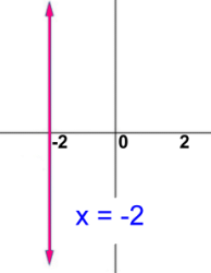 A non-oblique line is horizontal or vertical.The horizontal line y = 5 on the left will let you choose any x value, so the domain will be x ε R. However, all the points on this line have y value 5, so the range is y = 5. The vertical line at the right is different. Here all the points have x value -2, so the domain is x = -2. The y values are all Real numbers up and down, so the range is y ε R.