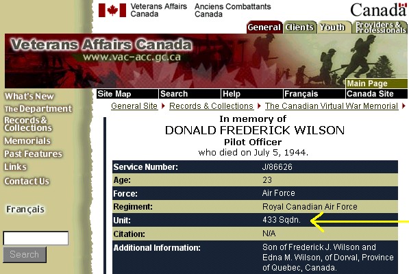 ![]() I began by searching the internet for any reference to my uncle. I came across a Government of Canada site, prepared by the Department of Veterans' Affairs, that kept lists of all persons who had been killed in the various wars that Canada had been involved in. At that site I found the page listing my uncle: ![]() There wasn't a lot of information, but I knew it was him because it listed his parents (who were my grandparents) and the city where they were living at the time. There were also some clues to his armed forces service. I noticed that he was listed as a 'Pilot-Officer', and that he belonged to the 433 Squadron. That gave me some information for another internet search: [continued...] |