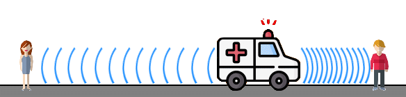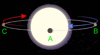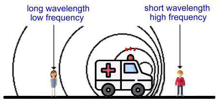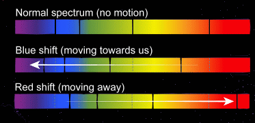 ![]() You have experienced the Doppler effect many times. For instance, imagine you're on the street and you hear an ambulance coming towards you. It's siren sound will be high in pitch. As it passes you, the pitch of the siren sound drops, and as it moves away from you, the pitch drops even more. The reason this apparent shift in pitch happens is because sound is a series of waves. Imagine the ambulance is stopped, and its siren is on. The waves of sound look like this: ![]() The waves have a distinct wavelength, which is the distance between the wave crests. You can see the wavelength above, which is about 10-20 cm. The wavelength results in a specific frequency for the sound. (Frequency is another name for pitch). There will be a certain pitch associated with the siren's sound waves, which you can hear when the ambulance is not moving. Now imagine you and a friend are on the street. The ambulance starts to move away from your female friend on the left, and towards you on the right. This is what it will first look like: ![]() As the ambulance begins to move, still emitting the siren sound at the same frequency, the waves moving towards you on the right will be compressed, while the ones moving toward your friend on the left will be lengthened. ![]() These apparent changes in wavelength will also change how you perceive the sound. The waves you hear on the right, being shorter in wavelength, will have a higher pitch. At the same time, the waves moving left, being longer in wavelength, will have a lower pitch to your friend. ![]() Notice that the frequency, or pitch, is inversely proportional to the wavelength. In other words, short wavelengths have high frequency, while long wavelengths have low frequency. The equation relating wavelength and frequency for sound is: frequency · wavelength = speed f · λ = vs where vs is the speed of sound, normally 343 m/s in dry air at 20 °C. It's important to note that the source of the pitch of the sound emitted by the ambulance siren doesn't change. What does change is how you perceive the sound, depending on whether the waves are moving toward or away from you. The Doppler effect is observed whenever a source of waves is moving with respect to an observer. The Doppler effect can be described as the effect produced by a moving source of waves in which there is an apparent upward shift in frequency for observers towards whom the source is approaching and an apparent downward shift in frequency for observers from whom the source is receding. The Doppler effect can be observed for any type of wave - water waves, sound waves, and light waves. We are most familiar with the Doppler effect because of our experience with sound waves. The Doppler effect is of great importance to astronomers, who use the information about the shift in frequency of electromagnetic waves (light) received by their instruments to determine whether something is moving towards us or away from us. This could be a moon, a distant planet around another star, a star cluster, a galaxy like our own Milky Way, or the edge of a rotating neutron star. The equation is the same: frequency · wavelength = speed f · λ = cs where cs is the speed of light, normally about 300 million m/s in a vacuum. Astonomers can also use the equation to determine the speed that an object is moving toward or away from us as it emits electromagnetic waves. They also use a picture made from the light that we receive from the object, shown as a spread-out 'spectrum' of all the frequencies in that light. Here's an example. Light from a planet orbiting a star reaches us. As the planet passes in front of its star, light from the planet in that position (A), not moving towards or away from us, would, if visible, yield a 'normal' spectrum. When we look at reflected light from the right side of the planet's orbit, when it's moving towards us (B), the spectrum of light appears 'shifted' towards the blue end of the spectrum. When we look at reflected light from the left side of the planet's orbit, when it's moving away from us (C), the spectrum of light appears 'shifted' towards the red end of the spectrum.