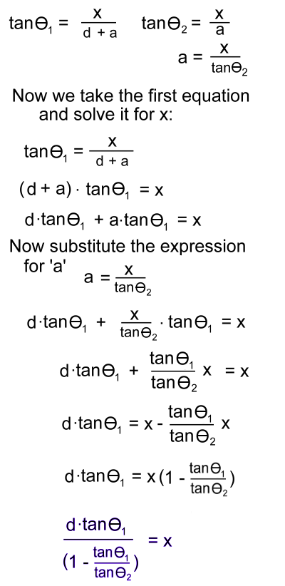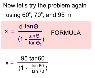 We'll redo the solution on the previous page, but replace : θ1 for 60° θ2 for 70° 'd' for 95 ![]() ![]() This can be entered and evaluated in one step on your calculator: x = 445.2 This gives us again an answer of approximately 445 m for the height of the building. Let's look at a third method, using the sin law >>> |