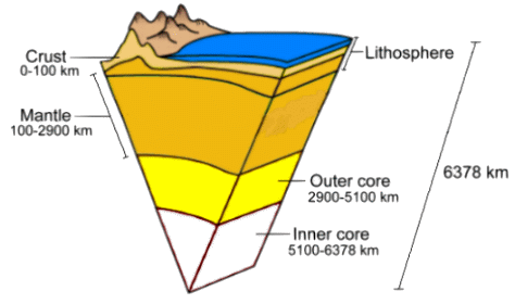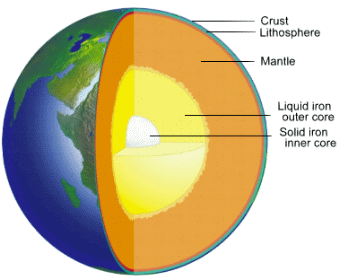 The crust is the rocky shell of the planet, and its thickness varies widely. Under the oceans, the crust is thinner – usually between 5 to 10 km, and made of denser rock like basalt. The crust of land masses can be a lot thicker, anywhere up to 100 km in mountainous regions, and made of a variety of lighter rock types.Proportional to the size of the Earth, the crust is similar in thickness to the shell on a chicken egg. The crust represents less than 1% of the Earth’s volume. The upper mantle layer starts under the crust. It is mostly a mix of silica and magnesia, which together make up about 84% of the mantle’s mass. The parts of the mantle below 200 km are less rigid, and are at such high temperatures and pressures that they act like a very slow moving liquid. Because of this we have what are known as tectonic plates, big chunks of lithosphere that float on the upper mantle. These move about as the heat from lower layers shifts the mantle underneath in convection currents, in the same way that hot air in the atmosphere rises and gets distributed by the winds. In the process called plate tectonics, the surface of the planet is split into massive rocky ‘plates’ the size of continents. These move around as new rock from deep within the Earth is pushed up by convection currents, and pushes the sections of lithosphere over the mantle below. These processes are the main cause of earthquakes and volcanic activity, and have led to the growth of many of Earth’s largest mountain ranges. The lower mantle is made of similar stuff to the upper part; the top of the lower mantle is at about 1000°C, with the lower levels hitting as much as 4000°C. Like the upper mantle, the lower mantle is still essentially solid, but moves around less than the upper layer, mostly because of the extreme pressure it is under. The outer core is quite different. Unlike the fairly solid upper layers, it is a dense mixture of liquid iron and nickel, ranging from 4000 to 5700 degrees C in temperature. The movement of this thick layer of molten metal is thought to be a major factor in creating the Earth’s magnetic field. The inner core is also made up of nickel and iron, but is under such incredible pressure that it remains a solid lump, roughly 70% the diameter of the moon. The pressure of all the mass above raises the melting points of the metals, and forces them to stay as solids despite a temperature of more than 5400°C. |