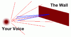 But there has to be more. You can yell all day at a building 75 metres away and not get an echo. What has to happen next is that a lot of the sound coming from you has to be made to bounce back. Notice that the words 'a lot' are underlined. Here's what happens under normal circumstances: The sound leaves your mouth, and travels for a while before it hits something. But sound doesn't travel in a straight 'beam' ... it comes out of your mouth and spreads in all directions. Only a little bit of it actually hits the building you're yelling at: