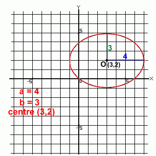 Let's look at a horizontally stretched ellipse that is 8 units wide and 6 units high, and shifted so that its centre is at the point (3,2).