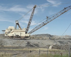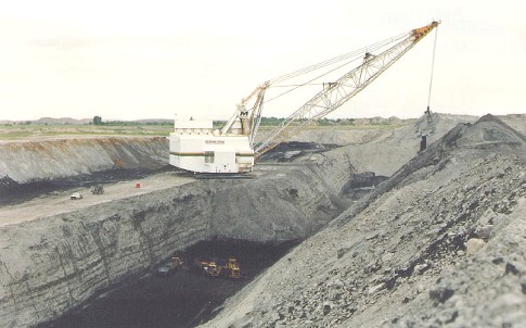 ![]() Occasionally they have to be moved across the highway, which requires the construction of an earth roadway so that the pavement isn't destroyed. These drag lines are powered by electric motors, so they also have a huge power cable. A 'walking drag line' is an excavator where the bucket is dragged by cables, rather than lifted by an arm. This allows the bucket to be much larger than those on shovels. Drag lines, because of their enormous size, can't move with wheels or bulldozer tracks; they move forwards using hydraulically operated 'feet', which raise and lower, one at a time. That's why they're called 'walking' drag lines. Below is a large photo of the mining operation at Bienfait, near Estevan. Notice the size of the other vehicles, even the earthmovers at the bottom of the pit, in comparison to the walking drag line. An old dragline bucket. Emily is standing inside; she's just over 5 feet 10 inches tall. This is one big bucket! Notice the teeth along the bottom edge; they're attached with bolts so that they can be replaced if they break or wear out. |