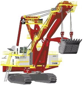 ![]() Here is a comparison, side by side, of a drag line and a shovel. Bucyrus-Erie is the American company which makes many of these machines. These pictures don't show the relative size of each; the shovel is actually much smaller. Drag lines can be a whole lot larger simply because the boom and arm of a shovel can't be supported if they get too large. The walking drag line on the left above is the Bucyrus model 2570WS, which has a bucket capacity of up to 120 cubic metres (160 cubic yards), and a boom length of 120 metres (400 feet). It can scoop up a single load weighing up to 360,000 kg, or 360 tonnes (400 tons). The machine itself weighs 7,200,000 kg (16,000,000 lbs). The shovel on the right has a 122,000 kg (122 tonne) bucket payload, only a third as big, but still respectable! Our research described many drag lines and large shovels built in the USA during the latter part of the 20th century, and the whereabouts of many of them are kept track of by people who are fascinated by these huge machines. Many of these pieces of equipment are given names, and people come from all across the country to watch it work and to take photographs; when an old one is no longer in use, support groups form to help raise money for its preservation. Specifications: Height: 67 m (220 ft) Boom Length: 61 m (200 ft) Bucket capacity: 79 cubic m (105 cubic yards) Bucket load: 145 tonne (160 tons) Machine weight: 6,400 tonnes (14,000,000 lbs) The Silver Spade, like all shovels, moves itself around on crawlers like a tank or bulldozer, except that the crawlers are much larger. The Spade has three double sets on each side, each one being 34 feet long and 8 feet high; individual pads on the tracks weigh about 2 tons each. Here are some photos of the Silver Spade in operation ... |