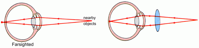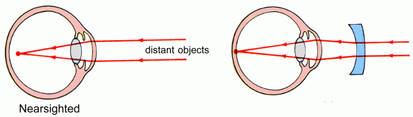 ![]() Myopia Myopia is nearsightedness. The lens can't focus properly on distant objects (you can only focus on things that are near). Distant objects actually come to a focus inside the eye too far in front of the retina. This can be corrected by placing an artificial concave lens in front of the eye, which spreads the light a little and allows the eye's lens to focus it properly on the retina. ![]() A laser can also be used to sculpt the cornea so its shape mimics the shape of concave corrective lenses, making the use of eyeglasses for nearsightedness unnecessary. Hyperopia Hyperopia is farsightedness. The lens can't focus properly on nearby objects (you can only focus on things that are far). Nearby objects actually come to a focus inside the eye too far behind the retina. This can be corrected placing an artificial convex lens in front of the eye, which converges the light a little and allows the eye's lens to focus it properly on the retina. ![]() Astigmatism If the shape of the eye or the shape of the lens itself is not spherical, the result is that the eye can focus on vertical lines in images, but not on horizontal ones. This will result in a slightly blurry image. This can be corrected by placing an artificial spherical lens in front of the eye. Cataracts