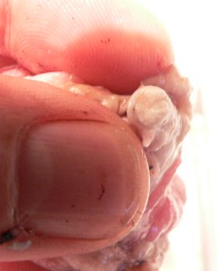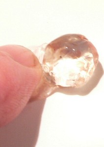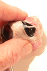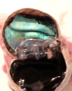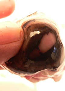 The lens was in the front of the eye right behind the pupil. Its surface was not a flattened ovoid shape, but was fairly bumpy and irregular. In the third photo you can see it in cross-section after it was cut in half. Surprisingly, its texture was much like wax, in that it could be squeezed out of shape if pressure was applied.
