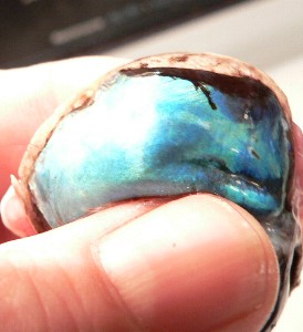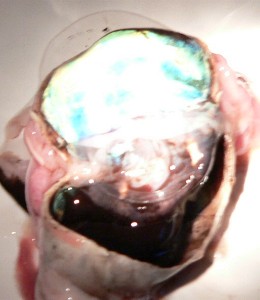 We examined the tapetum lucidum, a reflective layer at the back of the eye which acts like a mirror to increase the amount of light the photosensitive cells can collect. This allows many animals to see better under low-light conditions. The layer is a thin film stuck to the back of the eye, and is highly reflective. It is an iridescent blue colour in the elk eye. In the photos below, we stretched and sliced the layer so that you can see how thin it is. In the picture at the right below, we directed a flashlight at the layer in a dim room to make it clear that the layer really does relect light superbly.