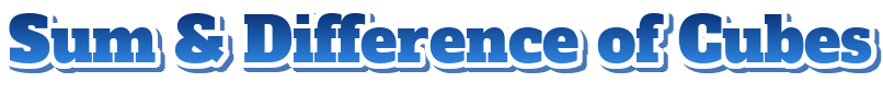 ![]() ![]() I've covered all the types of polynomial factoring a student will encounter in most high school math courses here. There are additional types that occasionally appear in Math 30 or Math 31, and of course in University math. One such type is the 'sum and difference of cubes'. The format for a polynomial that we'll factor looks like this: where An and Bn are perfect cubes. Here is an example of a perfect cube: 125x6y12 125 is the cube of 5. You need to be able to recognize numerical perfect cubes; you should recall memorizing these in grade 9 math, to make it easier to simplify cube roots in Math 10C. Variables with exponents are perfect cubes if the exponents are multiples of 3. So 125x6y12 is the cube of 5x2y4 Notice that the exponents were divided by 3 Now we're ready to factor a polynomial that is either a sum or difference of cubes. The first step is to memorize the pattern, just as you did for a 'difference of squares' in Math 10C.