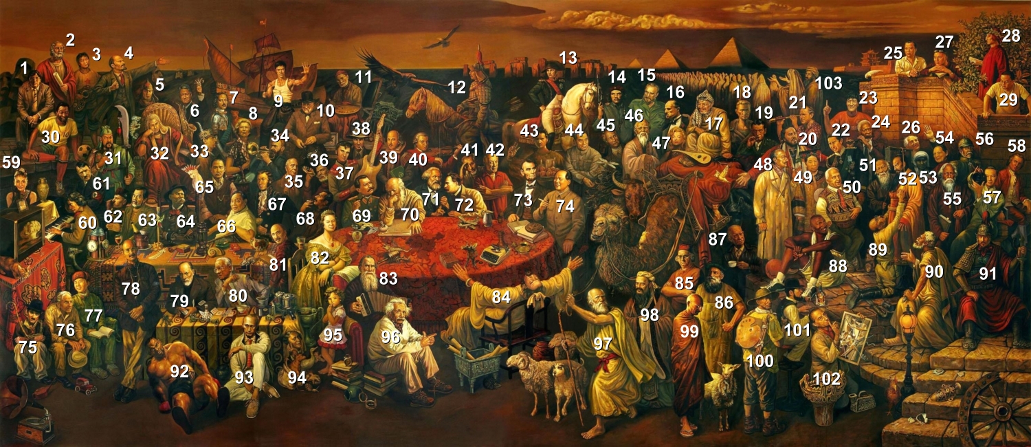 ![]() We have a challenge for you! Here is a list of 103 famous historical figures. It will open in a separate window. It's a PDF file, so you can print it if you want. Your mission, should you choose to accept it, is to identify as many of the people on the list as you can, who all appear in the photo below. The list is alphabetical, and does not correspond to the order that people appear in the picture. Clicking on the photo will enlarge it substantially. (Clicking again reduces it). You can then scroll left and right, and up and down, to see everyone in the photo. ![]() ![]() You can toggle back and forth between the enlarged photo and the page with the names, if you want. But it's much more satisfying to print the list and check them off one by one as you find them. Here's a blank checklist you can print and use to record your guesses. [Serious about this challenge? Here's a poster sized copy of the photo you can print. It's a 9.33 zipped download] See how many people you can identify correctly. Some are very obscure; an average score is about 40 out of 103 correct. When you're done and ready to see how you did, here are the correct answers. |