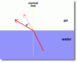 If the light hits the boundary at a large enough angle from the normal line, it will bend (refract) right back into the water! The light refracting downwards makes it look as if the light reflected off the boundary. This is called total internal reflection. Light does this when the angle at which it hits the boundary reaches the critical angle for that material.