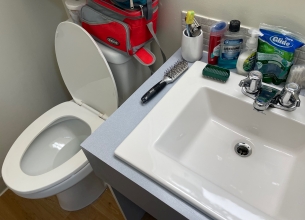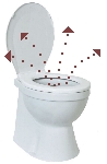 Apparently after using the toilet to poop, if you stand up to flush, the swirling water will send a fine mist of water droplets into the air which will contain tiny particles of fecal matter. These droplets will be deposited on all the surfaces near your toilet, including the sink, your toiletries, and most importantly, your toothbrush! This is similar to what happens when someone sneezes or farts. Here is a brief summary of this topic from the U.S. National Library of Medicine: "The studies demonstrate that potentially infectious aerosols may be produced in substantial quantities during flushing. Aerosolization can continue through multiple flushes to expose subsequent toilet users. Some of the aerosols desiccate to become droplet nuclei and remain adrift in the air currents. However, no studies have yet clearly demonstrated or refuted toilet plume-related disease transmission, and the significance of the risk remains largely uncharacterized".We're going to find out how much aerosolization occurs by doing a simple experiment. Clearly there are a number of variables here which we can't control, notably the size of the toilet and the strength of the flush. We'll do our best with the toilet we have. There is also the variability in poop size and texture; we speculate that diarrhea would probably provide the greatest droplet dispersal when flushing the toilet. Needless to say, we're not going to try to control that variable. If you're interested in how poop is produced, visit our page about the intestines. We'll simulate fecal matter in the toilet water with two varieties of fluorescent materials, a liquid and a powder. Both are non-toxic. These will show up using a small UV flashlight. We will invesigate the results after just one flush. The bathroom: