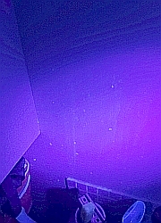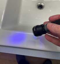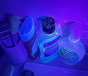 ![]() ![]() All surfaces were thoroughly cleaned. We used our UV flashlight to check for anything that might fluoresce, but found nothing. (As you'll see later, fluorescent material will show up as white specks in the UV light photos.) Trial 1: Fluorescent liquid